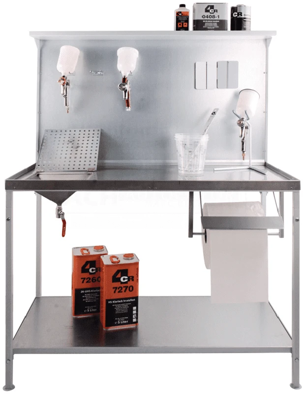 Anmisch- und Arbeitstisch für Lackierer. Mit Lackierpistolen- und Papierrollenhalter. Für mehr Ordnung und Übersicht am Arbeitsplatz.