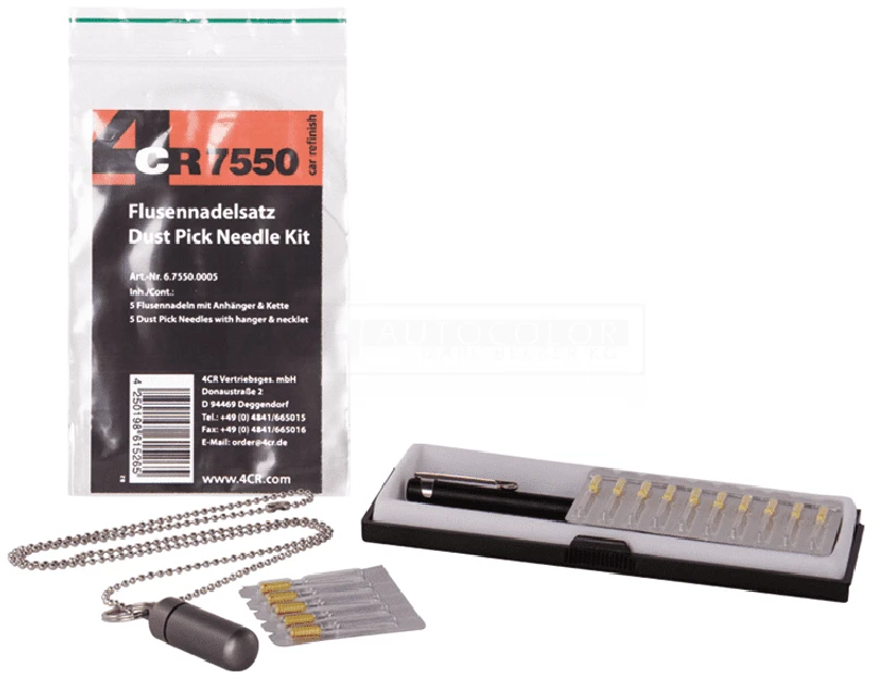 Mit mikroskopisch kleinen Häkchen versehene Flusennadeln, zum Entfernen von Staub auf frischen Lackierungen.