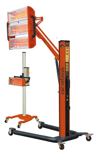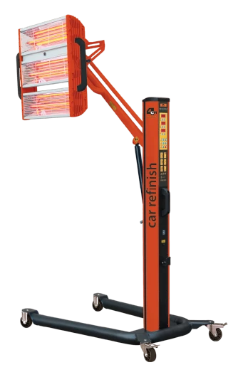 Mobiler Infrarot Lacktrockenstrahler. Die kurzwellige Strahlungsenergie dringt in die Lackschicht ein und trocknet diese auch von innen heraus. Durch den Abstandssensor ist eine Überhitzung am Objekt ausgeschlossen. Es sind folgende 3x Betriebsmodi möglich: „Interval“, Dauertrocknung“, „Automatik“. Alle Parameter: „Zeit“, „Leistung“ und „Abstand“ werden digital angezeigt. Jede Röhre lässt sich einzeln schalten um eine optimale kosteneffiziente Nutzung sicher zu stellen. Es besteht die Möglichkeit die Trocknung im „Pulse-Modus“ auszuführen.