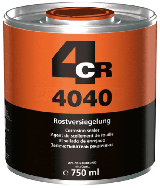 4040 Rostversiegelung setzt in Rostschichten enthaltene Feuchtigkeit in Kohlendioxid um und entzieht so dem Rost die Grundlage. Der Untergrund wird durch spezielle Polyurethane verfestigt und versiegelt. Sehr gute Tiefenwirkung, schneller und dauerhafter Korrosionschutz, direkt auf die verrosteten Schichten auftragbar, überlackierbar mit allen handelsüblichen 1K- und 2K-Grundierungen, stoppt auch Zinkkorrosion.
