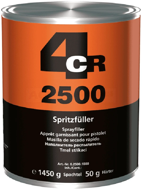 Der 4CR Spritzfüller 2500 ist ein 2-Komponenten-Spritzfüller auf Polyesterbasis für fabrikneue Stahlbleche oder geschliffene