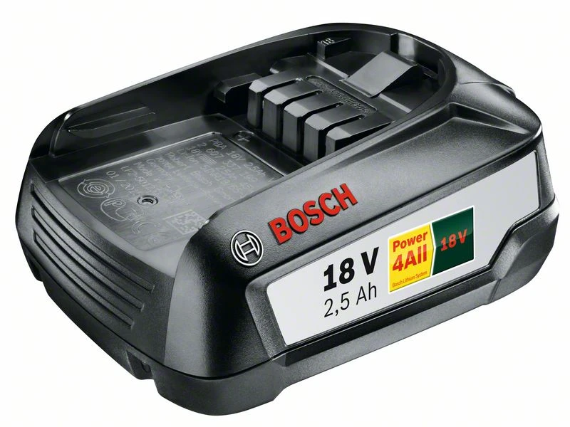 Akkupack 18 Volt Lithium-Ionen PBA 18 Volt, 2,5 Ah W-B. Systemzubehör. Höchstleistung für alle Heimwerker- und Gartengeräte des Power for ALL 18-Volt-Systems. Längere Laufzeit dank 2,5 Ah Akkukapazität. Kein Memory-Effekt, keine Selbstentladung, immer einsatzbereit dank Lithium-Ionen-Technologie. Besonders hohe Langlebigkeit durch Bosch Electronic Cell Protection (ECP). Power for ALL ist das Akkusystem mit Lithium-Ionen-Technologie für eine ganze Bosch Geräte-Familie in Haus und Garten: Der Akku kann mit allen Geräten des Power for ALL 18-Volt-Systems von Bosch flexibel kombiniert werden. Kompakte und robuste Bauweise mit einfach zu bedienender Entriegelung. Softgrip für sicheres Abstellen und bequeme Handhabung. Ein Akku für alle Passend für alle Heimwerker- und Gartengeräte der Power for ALL Lithium-Ionen-Akkusysteme.