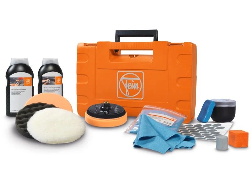 •Lackaufbereitungs- und Finishing-Set Ideale Zusammenstellung für die Lackaufbereitung von verwitterten und neuwertigen Lacken. Ebenfalls perfekt geeignet für das Finishing von frischen Lacken (Nicht geeignet für Matt-Lacke). Inhalt im Kunststoffkoffer: 1 FEIN 1-Stufen-Poliermittel 1 kg; 1 FEIN Top Wachs Lackversiegelung 1 kg; 1 Stützteller 150 mm; 1 Lammfell 150 mm; 2 mittelharte Polierschwämme orange 150 mm; 1 Waffelschwamm; 53 Schleifblüten K2800; 1 Handschleifblock; 1 Befeuchtungs-Würfel; 1 Reinigungsknete 200 g; 2 Microfasertücher.