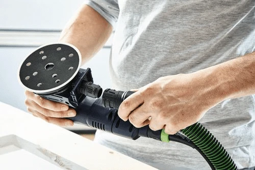 - Mit plug it-Netzadapter als Schleifmaschine mit unbegrenzter Laufzeit im elektrischen Dauerbetrieb – ideal in Kombination mit einem Festool Absaugmobil im Innenbereich