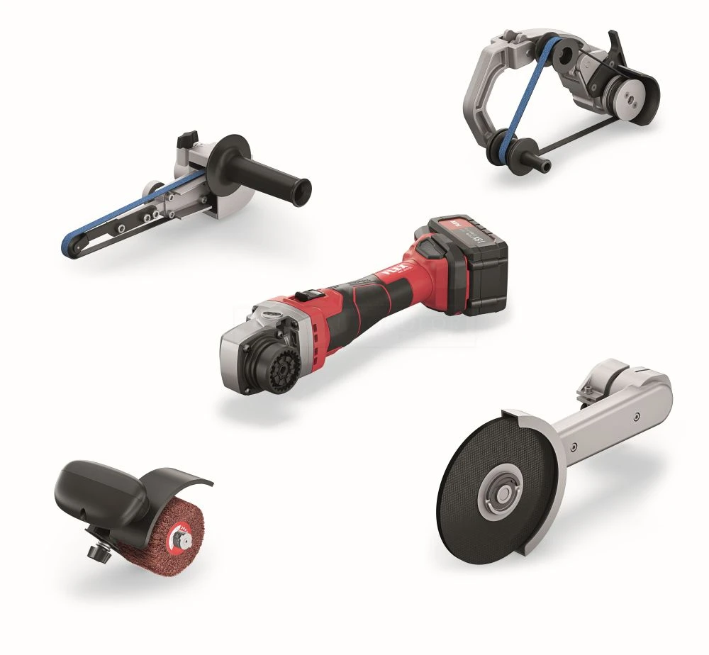 - Einzigartiger Werkzeugvorsatz mit Schnellkupplung zum werkzeuglosen Wechsel der vier System-Vorsätze zum Satinieren und Rohrbandschleifen, zum Schleifen mit Bandfeile oder Kehlnahtschleifer