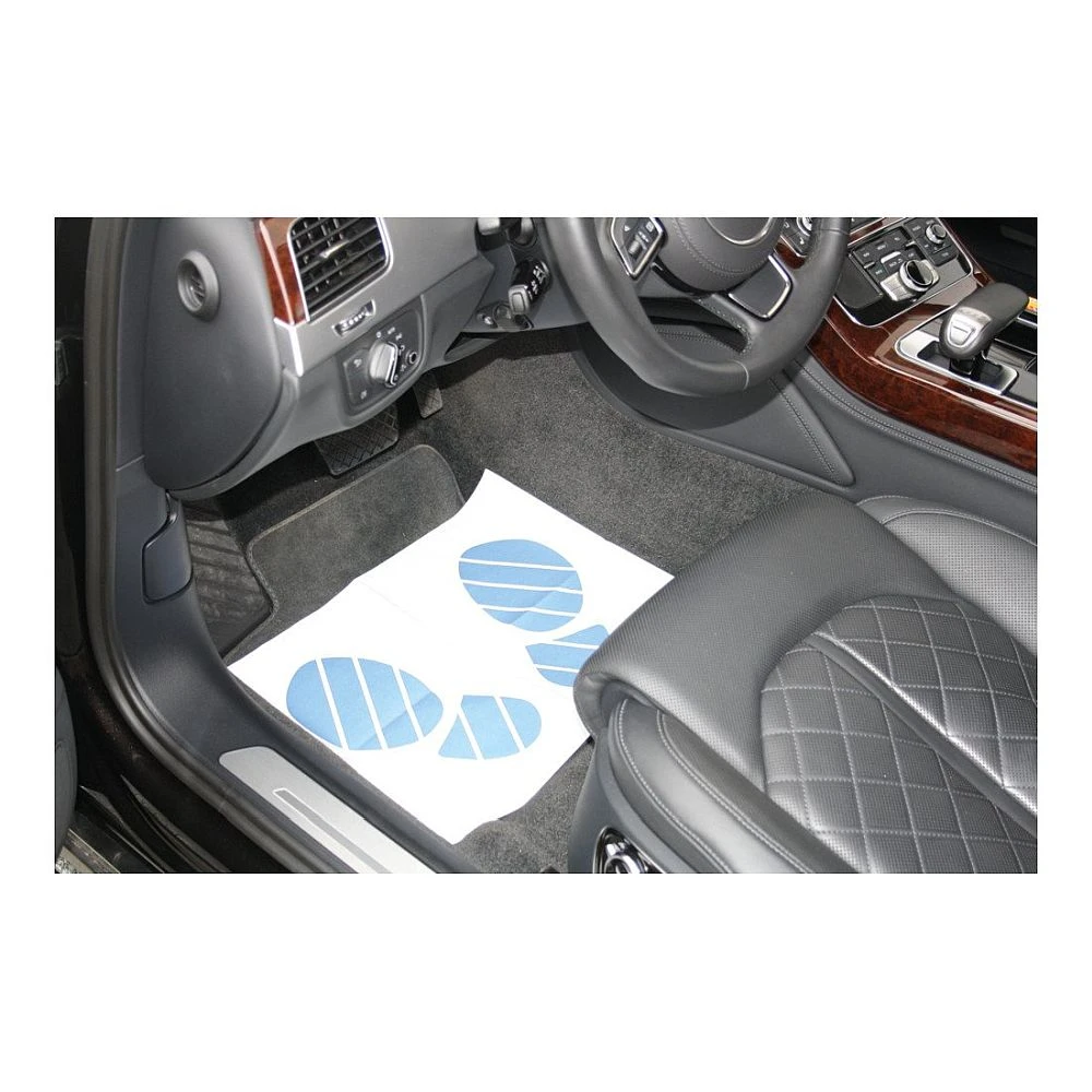Fußmatten zum Schutz des Fahrzeuges gegen Verschmutzungen während der Reparatur. Kombiniert die Vorteile von Papier und Folie. Das Papier oben saugt Wasser und Öl auf. Die Folie unten verhindert ein Durchnässen.