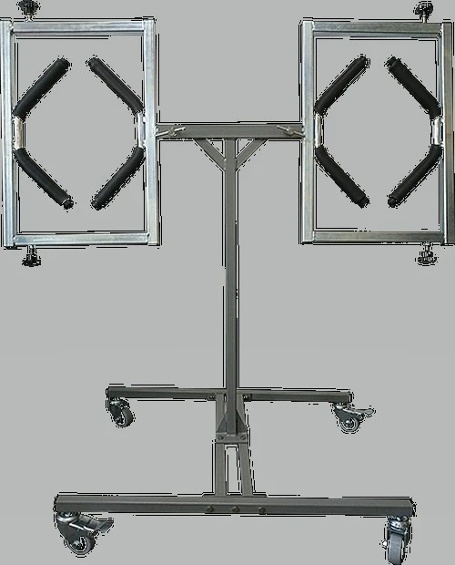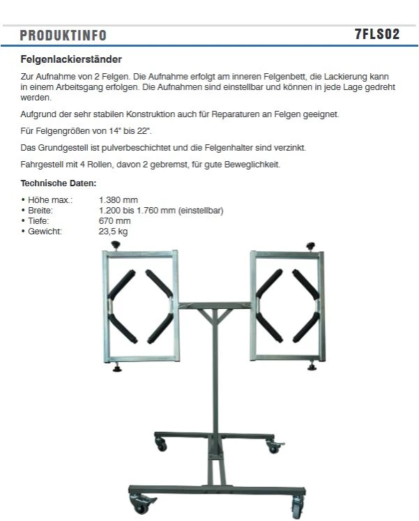 Zur Aufnahme von 2 Felgen. Die Aufnahme erfolgt am inneren Felgenbett, die Lackierung kann in einem Arbeitsgang erfolgen.Die Aufnahmen sind einstellbar und können in jede Lage gedreht werden. Aufgrund der sehr stabilen Konstruktion auch für Reparaturen an Felgen geeignet. Für Felgengrößen von 14″ bis 22″. Das Grundgestell ist pulverbeschichtet und die Felgenhalter sind verzinkt. Fahrgestell mit 4 Rollen, davor 2 gebremst, für gute Beweglichkeit.