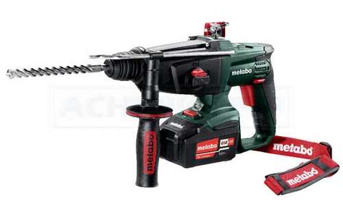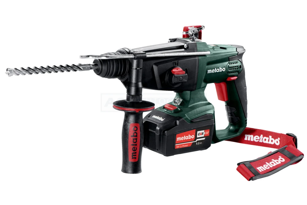 Hammerfutter für Werkzeuge mit SDS-plus-Einsteckende, gummierter Zusatzhandgriff, Bohrtiefenanschlag, Tragegurt, 2 Li-Power Akkupacks (18 V/5,2 Ah), Ladegerät ASC 55 „AIR COOLED“, Kunststoffkoffer