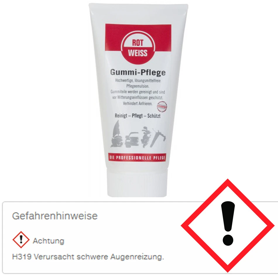 Die ROTWEISS Gummi-Pflege ist eine hochwertige, lösungsmittel- und silikonfrei Pflegeemulsion, die Gummiteile vor Witterungseinflüssen schützt. Ihre pflegenden Inhaltsstoffe machen das Gummi geschmeidig und vermindern so Quietschgeräusche. Im Winter wird das Anfrieren der Gummidichtungen verhindert. Hinterlässt bei richtiger Dosierung keine weißen oder grauen Rückstände.
