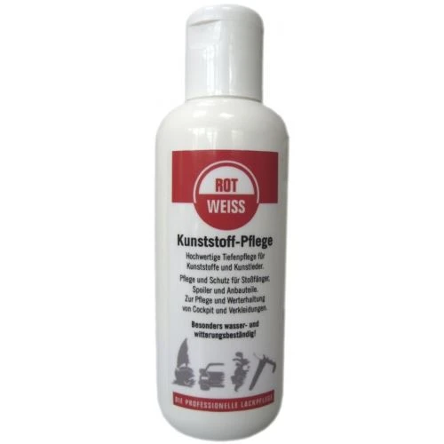 ROTWEISS Kunststoffpflege verhindert ein Verspröden dieser Materialien. Durch lang anhaltende Porenversiegelung lassen sich Stoßstangen, Rückspiegel usw. leicht reinigen.