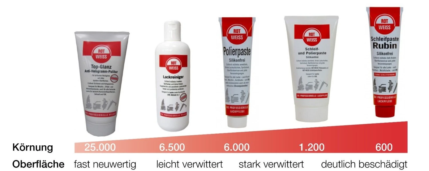 Produktreste mit nebelfeuchtem ROTWEISS Mikrofasertuch FEIN abnehmen. Oberfläche dann mit einer feineren Paste z.B. ROTWEISS Polierpaste weiterbearbeiten.