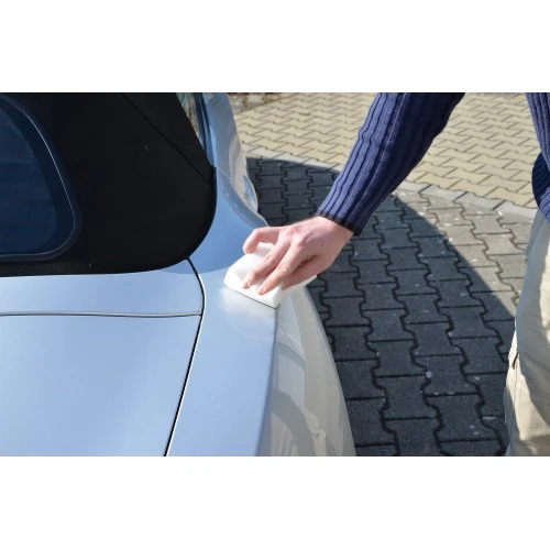Produktreste mit nebelfeuchtem ROTWEISS Mikrofasertuch FEIN abnehmen. Oberfläche dann abschließend mit einer Versiegelung wie z. B. ROTWEISS Sprühwachs schützen.