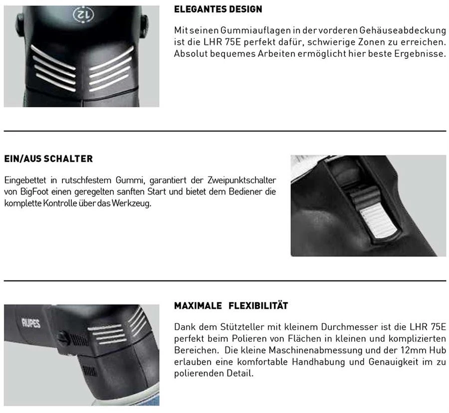 Mit ihren rutschfesten Gummieinsätzen an der Frontkappe ist die LHR 75E perfekt geeignet für alle Bearbeitungen in schwer zugänglichen Bereichen. Der Bediener kann dank der perfekten Ergonomie bequem polieren und optimale Resultate erzielen.