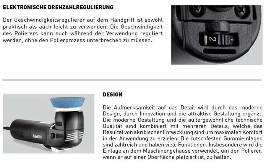 Die Entwicklung von Details beschränkt sich nicht auf innovatives und ansprechendes Design: Neben modernen Linien und einer sehr hohen technischen Qualität sind verschiedene Details vorhanden, die das Ergebnis einer im spezifischen Fall auf den maximalen Komfort des Bedieners ausgerichteten Forschungstätigkeit darstellen. Die zahlreichen rutschfesten Gummieinsätze haben verschiedene Funktionen. Auf den Einsatz am Maschinenkörper kann die Poliermaschine abgelegt werden. Dieser Einsatz verhindert auch eine eventuelle Verformung des Puffers und des Schleiftellers infolge eines nicht korrekten Ablegens des Werkzeugs.