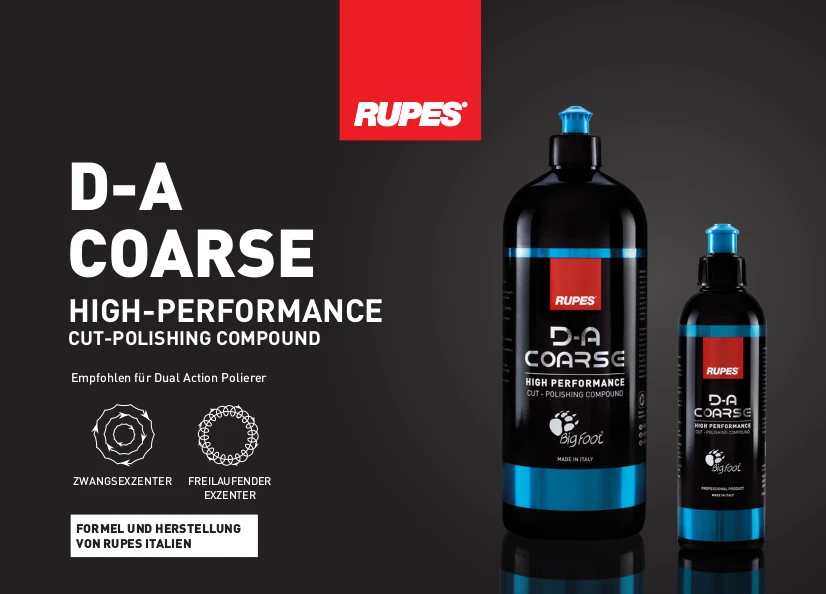 RUPES D-A COARSE die neueste Hochleistungs-Politur von RUPES ist auf maximale Effizienz ausgelegt. Diese schnell schneidende Politur ist ideal für Benutzer, die eine rasche Fehlerbeseitigung und ein reibungsloses Benutzererlebnis für jede Art von Lacken wünschen. Die Formulierung wurde optimiert, um die beste Leistung zu erzielen, wenn RUPES Coarse blaue Schwämnme oder Woll-Polierscheiben zusammen mit BigFoot Exzenter-Polierern verwendet werden, sowohl freilaufende als auch zwangsexzenter Polierer. Es stellt eine signifikante Verbesserung in Bezug auf Schneidleistung und Endbearbeitung mit geringem Staubanfall und leichtem Abwischen dar.