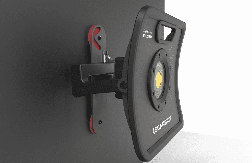 Spezialangefertigte Universalhalterung für flexible Montage von allen NOVA- und VEGA-Arbeitsleuchten auf magnetischen Oberflächen.